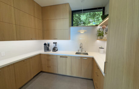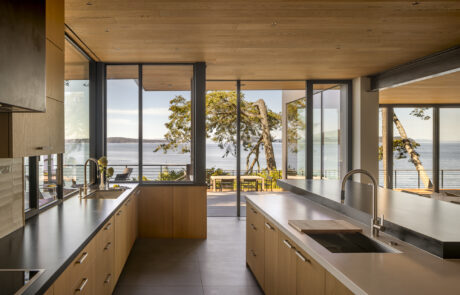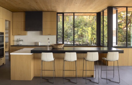 Inside, the oak ceiling and custom European white oak cabinetry bring warmth and natural elegance to the space, beautifully grounded by large-format concrete-look tile flooring. At the center, a massive raised island anchors the kitchen, with a seating counter made from a single slab of dark gray schist stone—its bold contrast setting off the seamless white Krion countertops used throughout the prep zones and pantry. Naturally antimicrobial, food-safe, and 100% recyclable, Krion was selected for its durability, beauty, and sustainability.