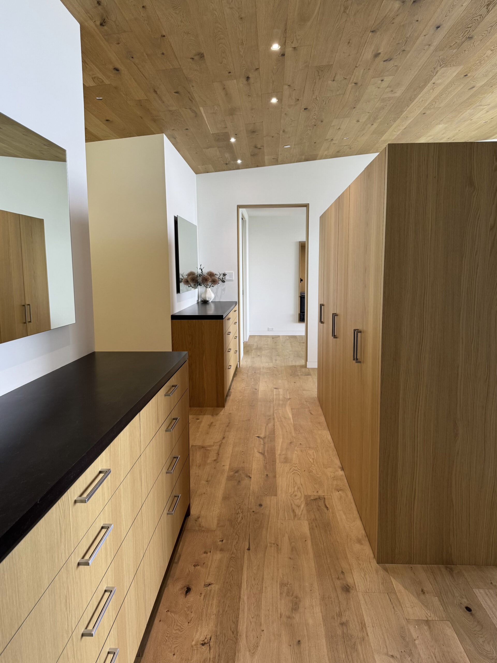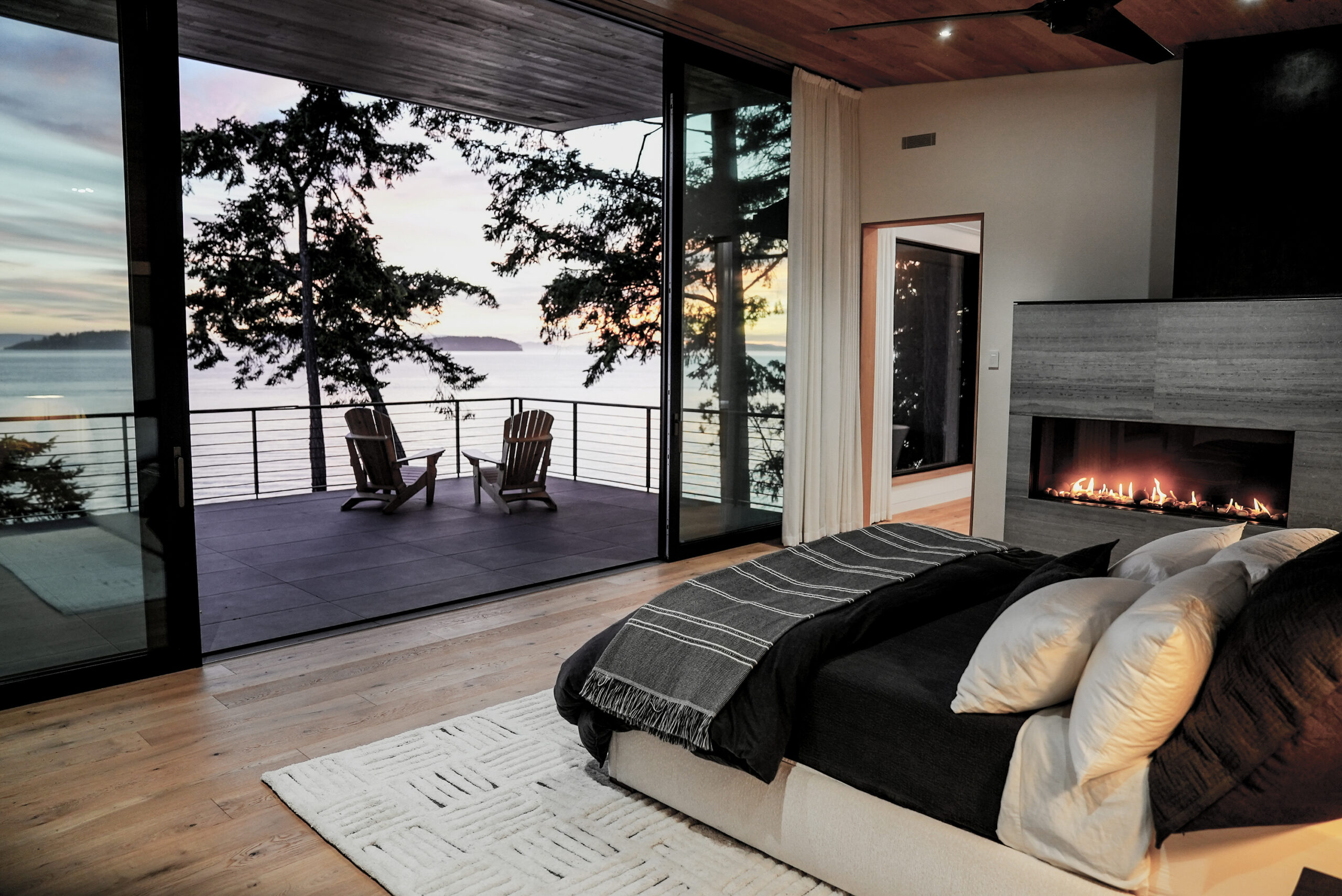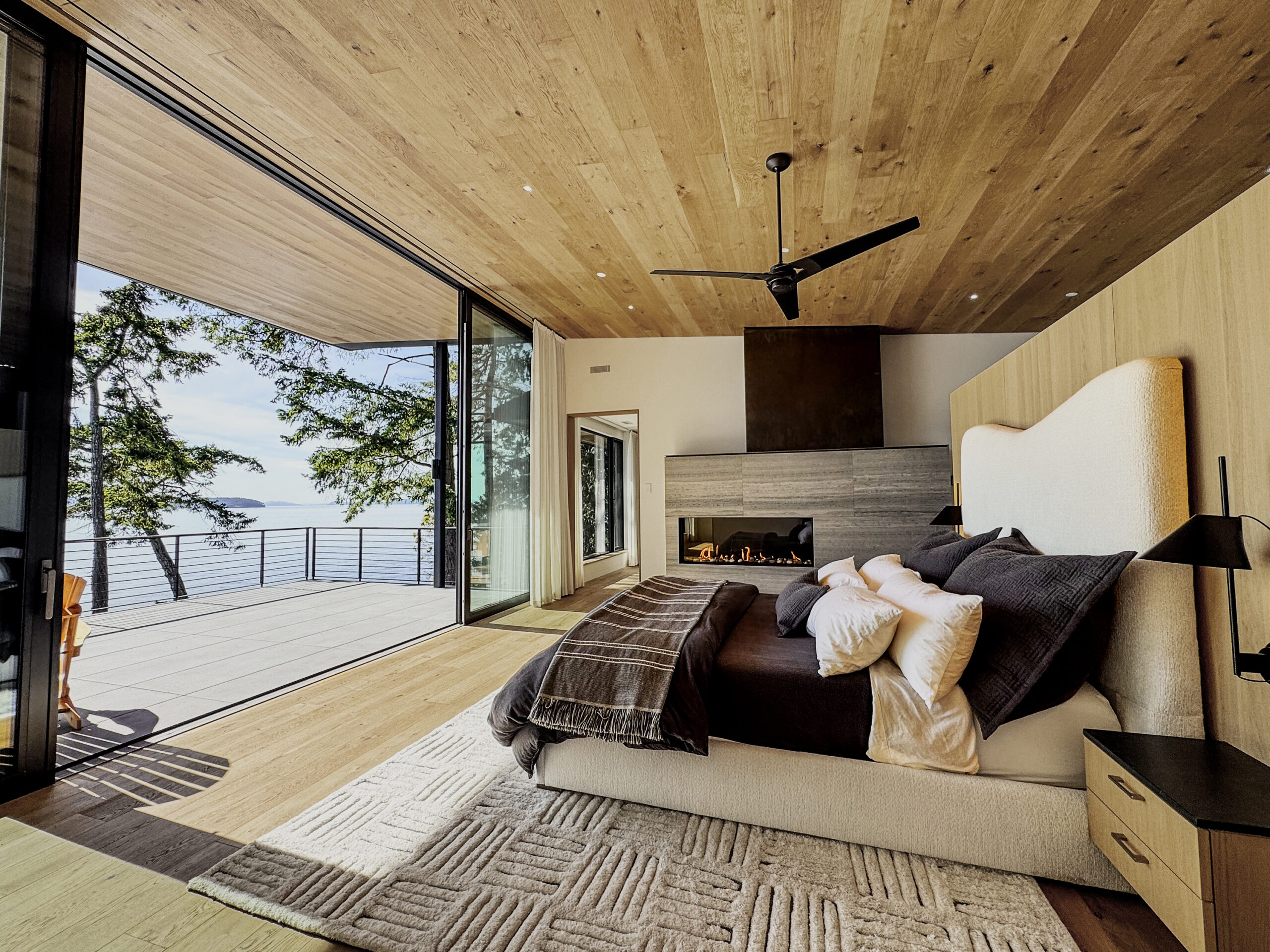 The entire upper level is devoted to a private, wellness-focused primary retreat—an elevated haven of luxury designed to nourish both body and mind. Clad in European white oak on the floor and ceiling, the suite flows seamlessly to a cantilevered roofline and expansive ocean-facing deck, creating an uninterrupted connection between indoor serenity and the dramatic coastal landscape.