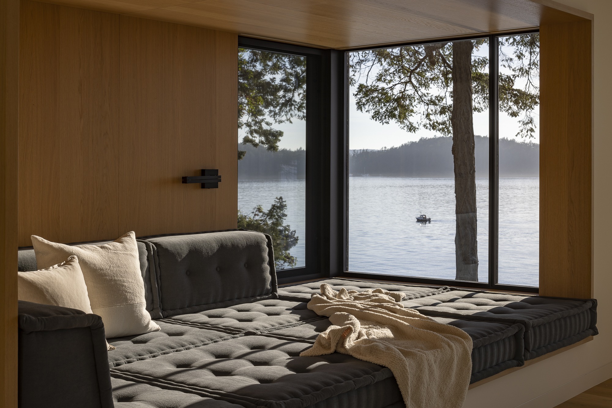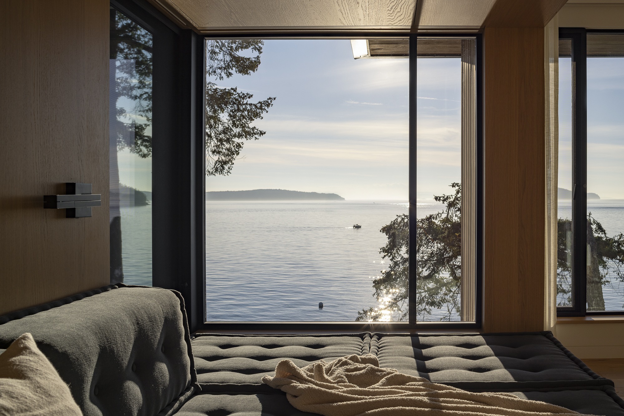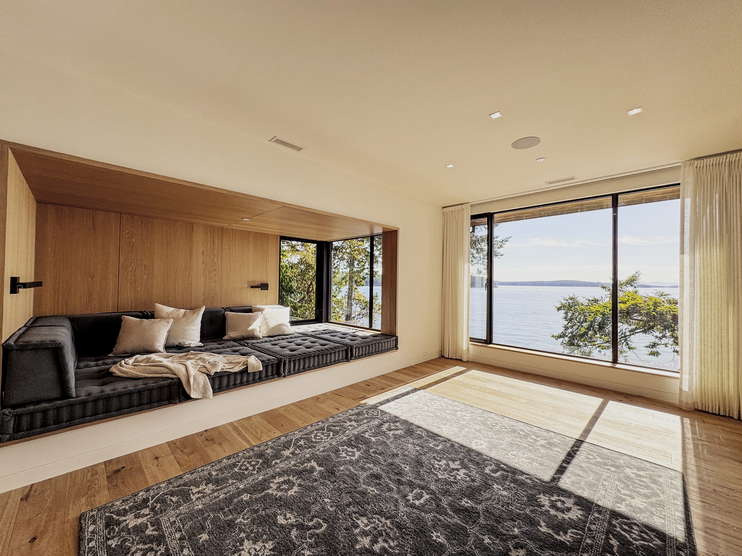 A dedicated wellness lounge at the ocean-facing corner provides a peaceful space for yoga, stretching, or quiet reflection. This raised built-in nook, entirely wrapped in white oak and topped with custom cushions, appears to hover above the sea—like a floating retreat for reading, relaxation, or watching TV.