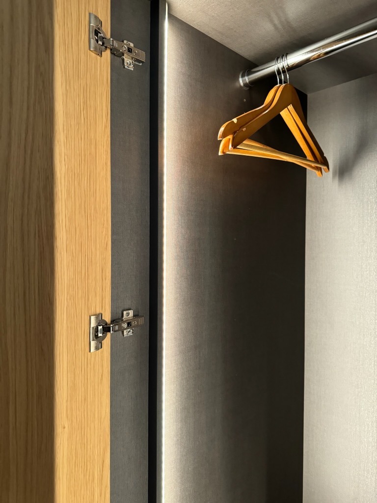 Anchored by a marble- and steel-wrapped Ortal fireplace, the bedroom is both architectural and inviting. A custom floating headboard, crafted from Euro white oak, elegantly divides the space—serving as a clean backdrop for the king-size bed, flanked by floating night tables with Louis Poulsen sconces, while concealing fully integrated closets on the reverse. On the closet-facing side, the headboard forms part of a dedicated dressing area featuring dual built-in drawer hutches, glowing silhouette Electric Mirrors, and a floating bench—creating a refined, light-filled environment for daily routines.