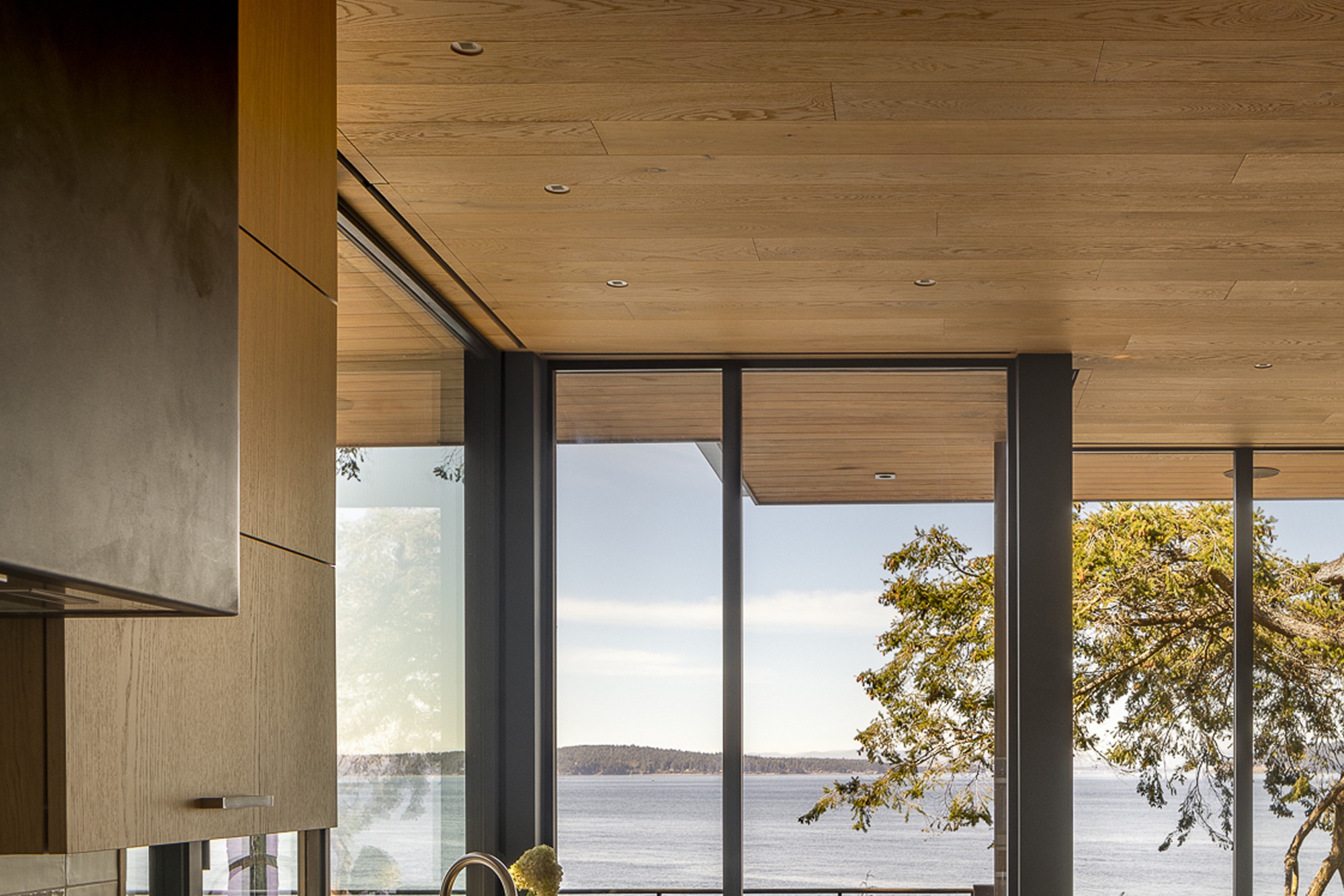For audio, James Loudspeakers small aperature series were flush-mounted into the wood ceilings in main living areas and primary bedroom, delivering sound through minimal apertures that virtually disappear. Inside each of these speakers is a powerful yet compact subwoofer, coupled with a module that handles the midrange and high frequencies.